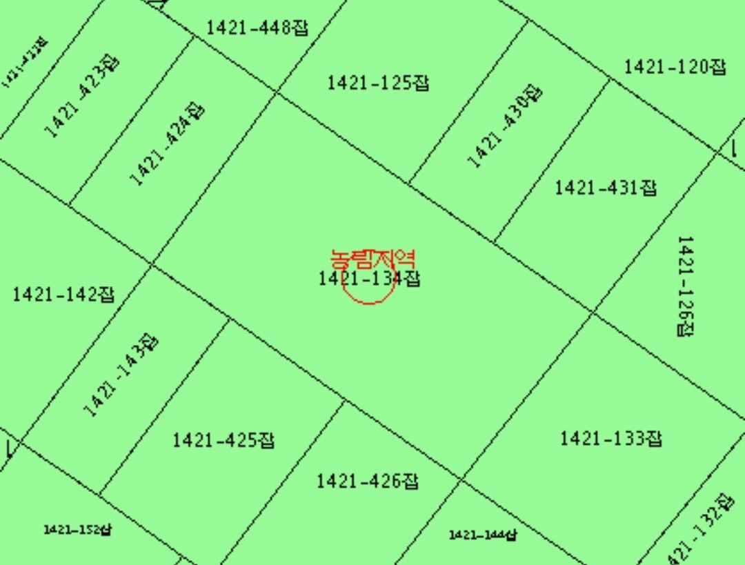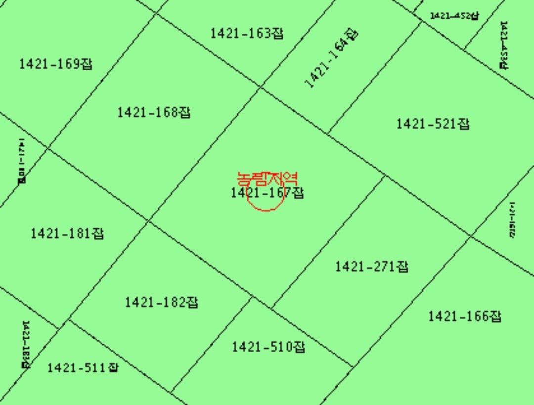 두필지 공히 농림지역, 가축사육제한구역(1000m 닭/오리/메추리), 농업진흥구역의 잡종지이고 지적 및 현황상 도로가 없는 맹지이며 연접 토지와 경계 구분없이 일단으로 벼농사를 경작중이고 ①과 ②는 직선으로 약 150m 거리이며 일괄 매매나 필지별 매매 모두 가능합니다.