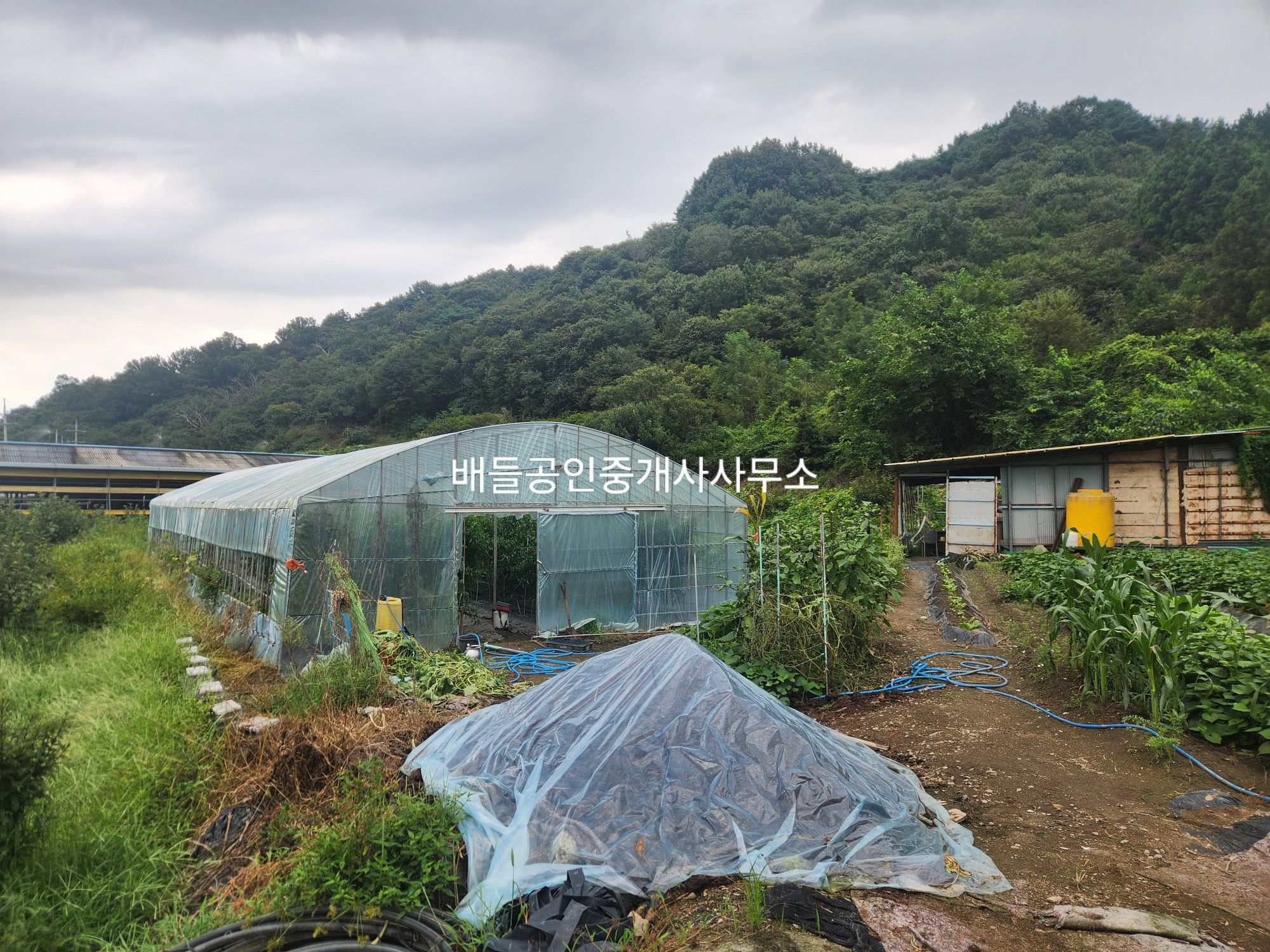 대지와 연접한 답 1957㎡(592평)은 밭농사를 경작중인데 비닐하우스 약 80㎡(24평)와 180㎡(54평)의 2개동과 가설 창고 약 30㎡(9평)이 지어져 있습니다.